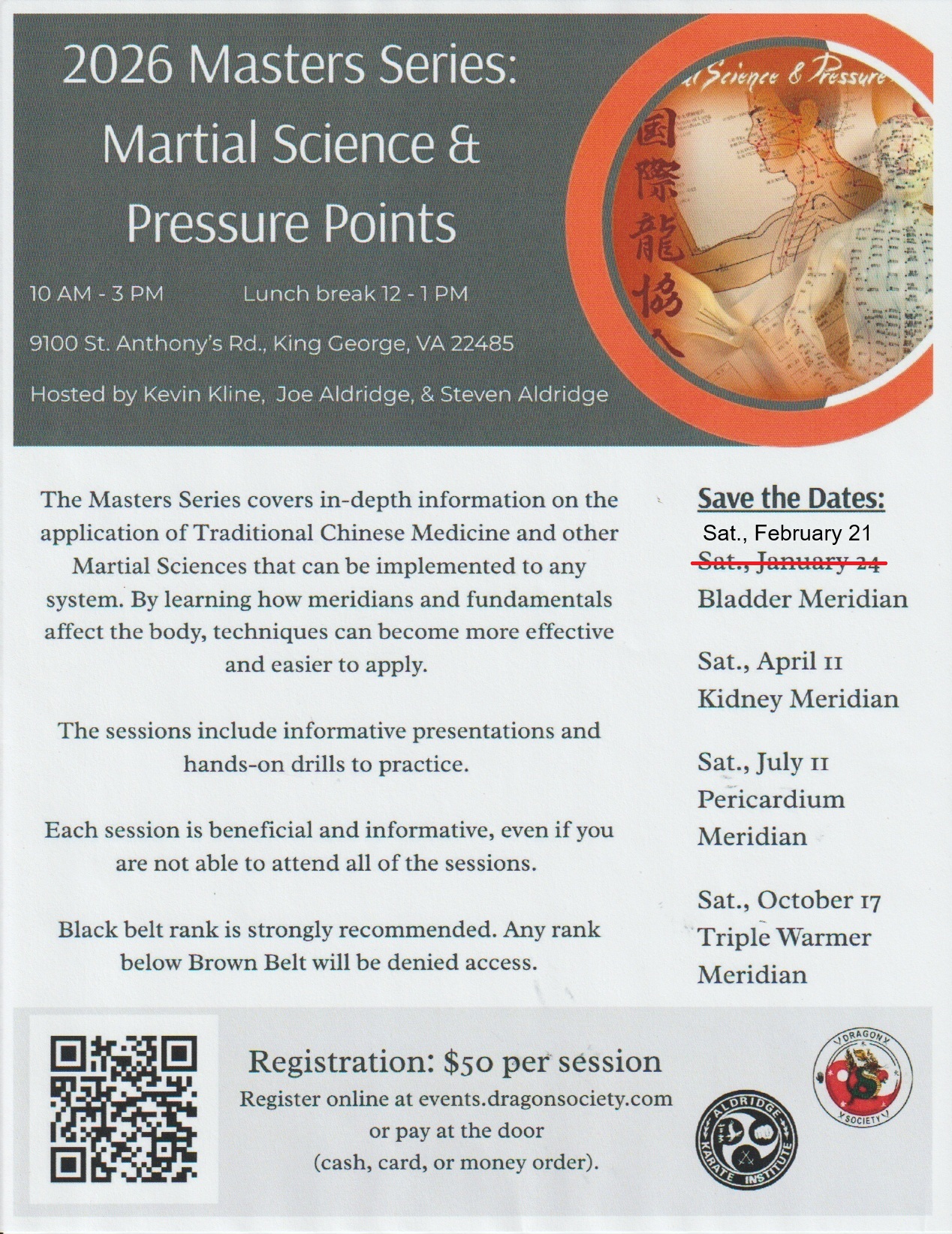 10 A.M. to 3 P.M. with an one hour lunch break. Session 1 Feburary 21, 2026 Subject The Bladder Meridian Rescheduled Session 2 April 11, 2026 Subject The Kidney Meridian Session 3 July 11, 2026 Subject The Pericardium Meridian Session 4 October 17, 2025 Subject The Triple Warmer Meridian This is a continuing series. 2027 sessions will be announced later this year.